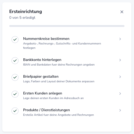 Nach der Registrierung wirst du automatisch durch das Setup geführt. Dabei erfasst du die grundlegenden Unternehmensdaten. Das Setup zeigt dir klar an, welche Pflichtfelder ausgefüllt werden müssen und führt dich Schritt für Schritt durch die Einrichtung.