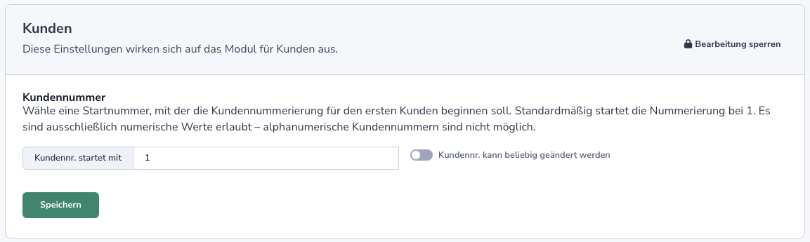 Du kannst die Kundennummer zentral definieren indem du in dem Feld „Kunden. startet mit“ die erste Kundennummer bestimmst. Danach wird die Kundennummer automatisch mit jedem neuem Kunden hochgezählt und dem Kunden zugewiesen.